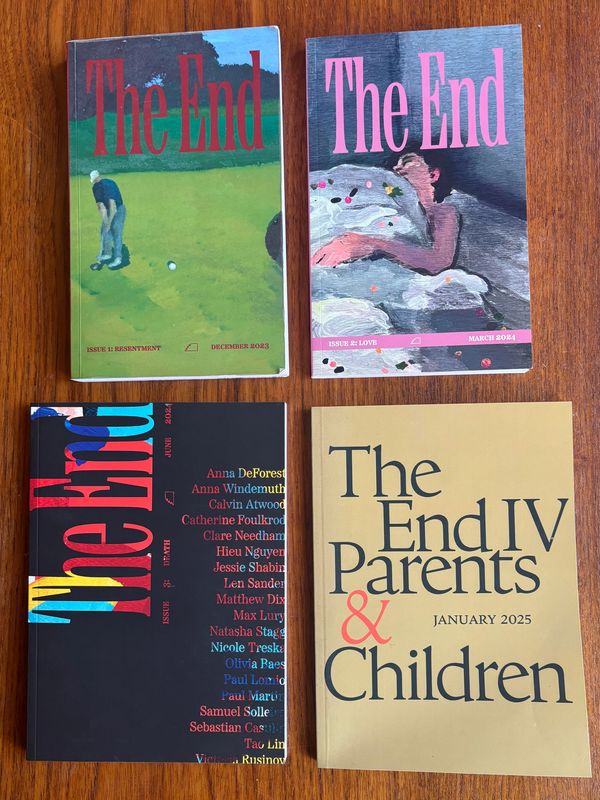 The End 4: Parents & Children was released in January 2025. It included the writers (in order of appearance) August Lamm, Calvin Atwood, Zsófia Paulicovics, Darina Sikmashvili, Zac Smith, Josh Boardman, Linnie Greene, Eli Woloshin, Jay Graham, Mary Elizabeth Dubois, Kira Homsher, Robert G., Amanda Larson, Sarah Edwards, Natalie Viebrock, and Purbasha Roy. The inside covers featured a photograph by Simon Sarris.